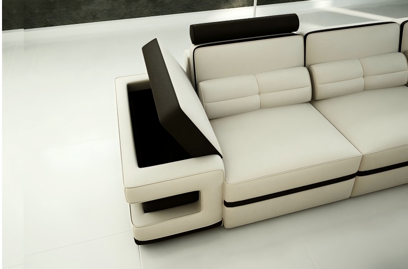 এই বৃহত এল-আকৃতির চামড়ার সোফা উপাদেয় এবং নরম প্রাকৃতিক জমিন দিয়ে শীর্ষ-গ্রেড আমদানি করা গরু দিয়ে তৈরি। এটি একটি কম-কী বিলাসবহুল টেক্সচার দেখায় একটি মিনিমালিস্ট বিরামবিহীন ডিজাইনের সাথে জুটিবদ্ধ।