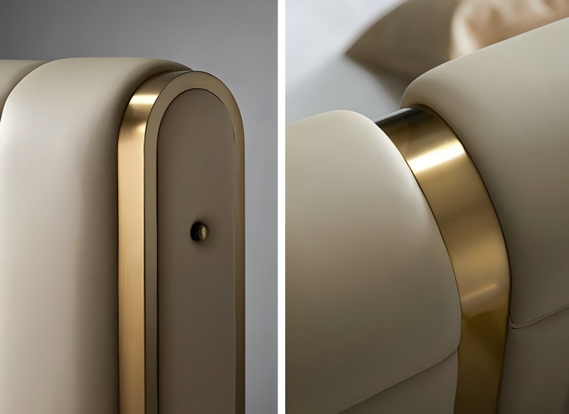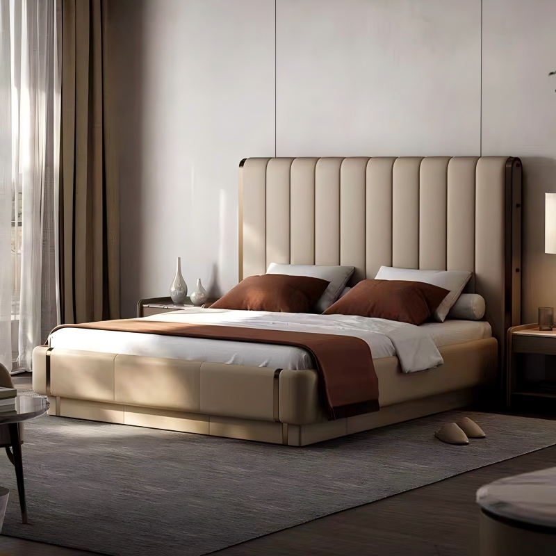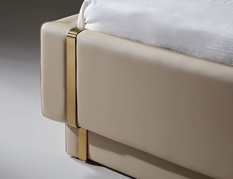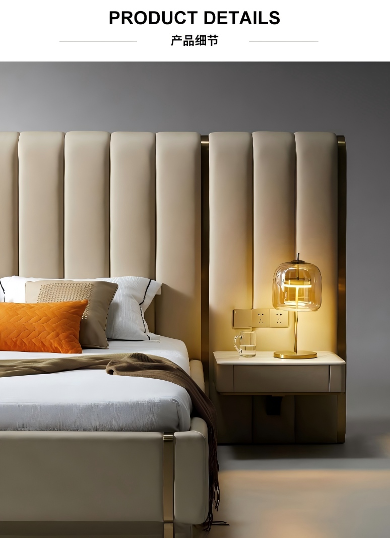 হালকা লাক্সারি মাস্টার বেডরুমের থ্রি-পিস সেট "1.8 মি চামড়া বিছানা + ডাবল বেডসাইড টেবিল | শীর্ষ স্তর কাউহাইড, ভাসমান নকশা
