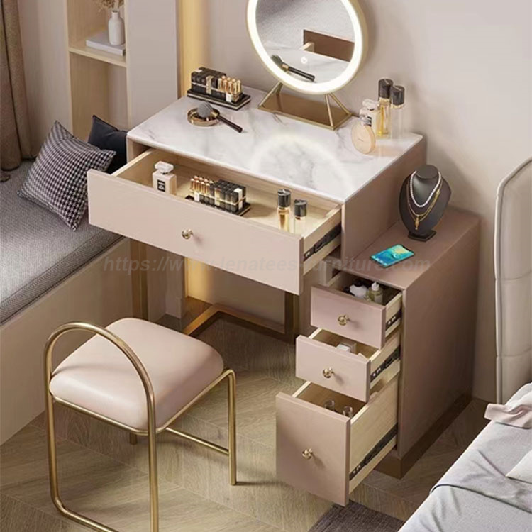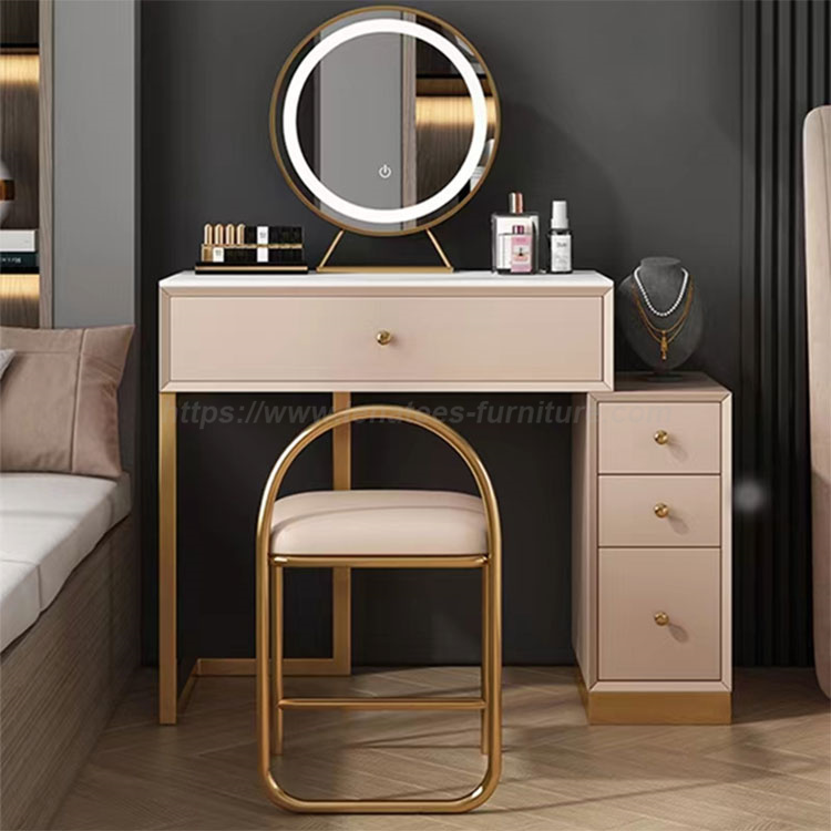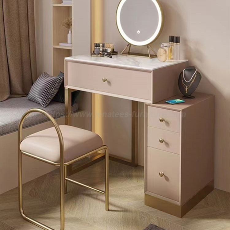 বিলাসবহুল আধুনিক সহজ ছোট অ্যাপার্টমেন্ট ভ্যানাটি টেবিল আপনার মেকআপ এবং আনুষাঙ্গিক এই মার্জিত ড্রেসারের সাথে সংগঠিত রাখুন। ডেস্কের ড্রয়ারগুলিকে টুকরো টুকরো করে ভাগ করা হয়েছে, যা আপনাকে আপনার লিপস্টিক, ফাউন্ডেশন এবং সৌন্দর্যের সরঞ্জামগুলি সংরক্ষণ করার জন্য সুশৃঙ্খল স্থান প্রদান করে। এছাড়াও, আপনাকে অন্যান্য প্রয়োজনীয় জিনিসপত্র সঞ্চয় করার জন্য পর্যাপ্ত জায়গা প্রদান করার জন্য তিনটি ড্রয়ারে বিভক্ত একটি কর্নার ক্যাবিনেট রয়েছে। মার্বেল ডেস্কটপ, জলরোধী এবং স্ক্র্যাচ-প্রুফ, বজায় রাখা সহজ। এছাড়াও, সাদা এবং সোনার সংমিশ্রণ আপনার ঘরে কমনীয়তার অনুভূতি যোগ করে।